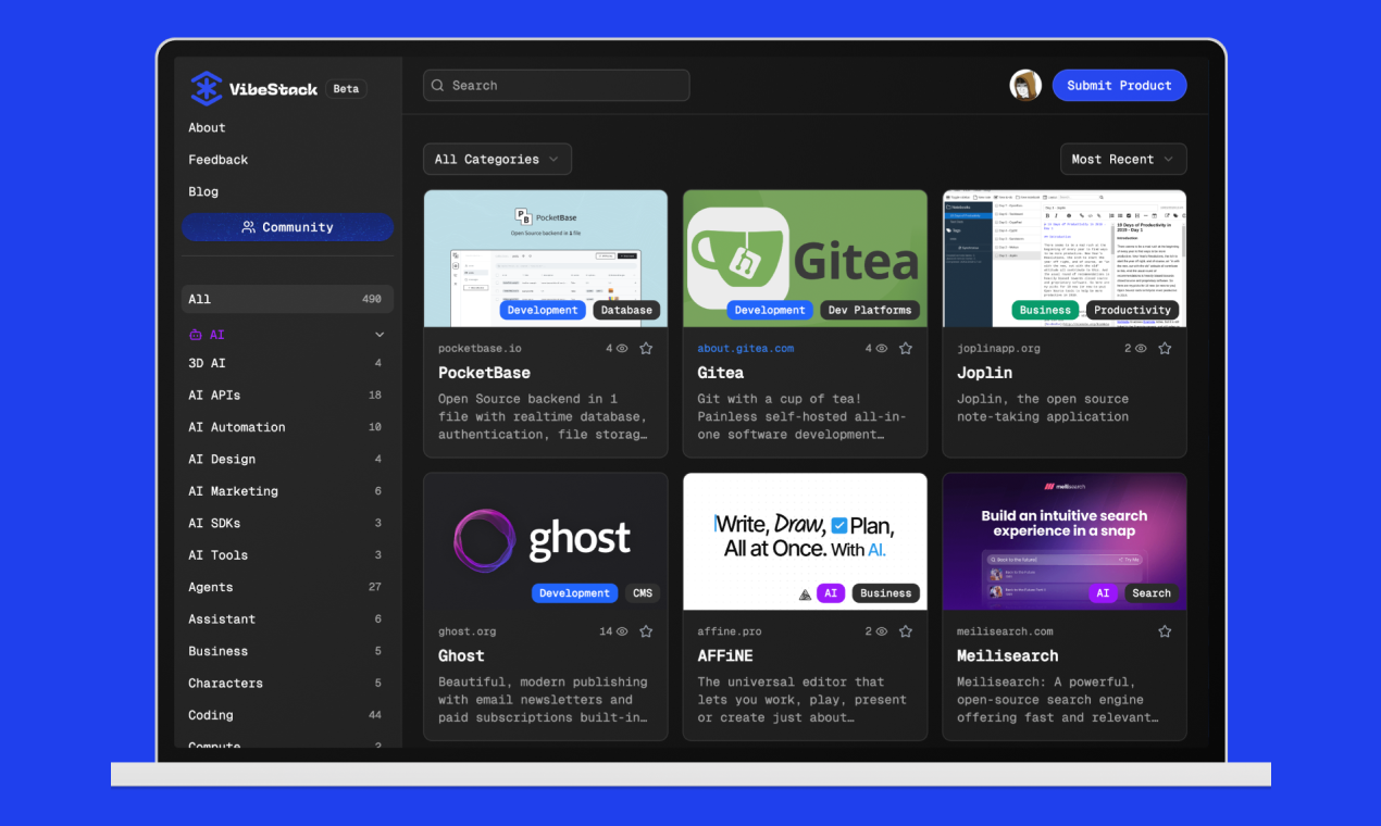 VibeStack is a curated discovery platform for AI, design, and development products and tools for builders and creators. It helps professionals find and save high-quality tools organized by category to enhance their creative workflow.